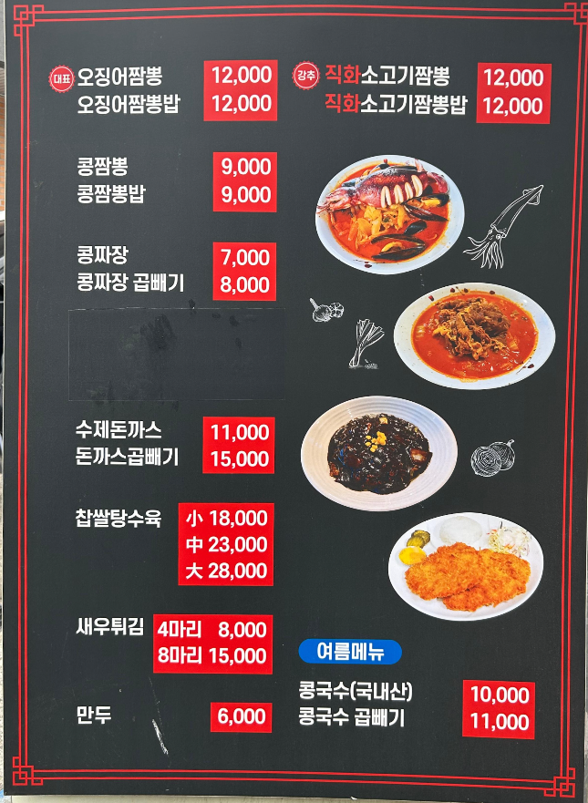 오징어콩짬뽕(밥) 12,000원  /  직화소고기짬뽕(밥) 12,000원   /  콩짬뽕(밥) 9,000원  /  콩짜장 7,000원