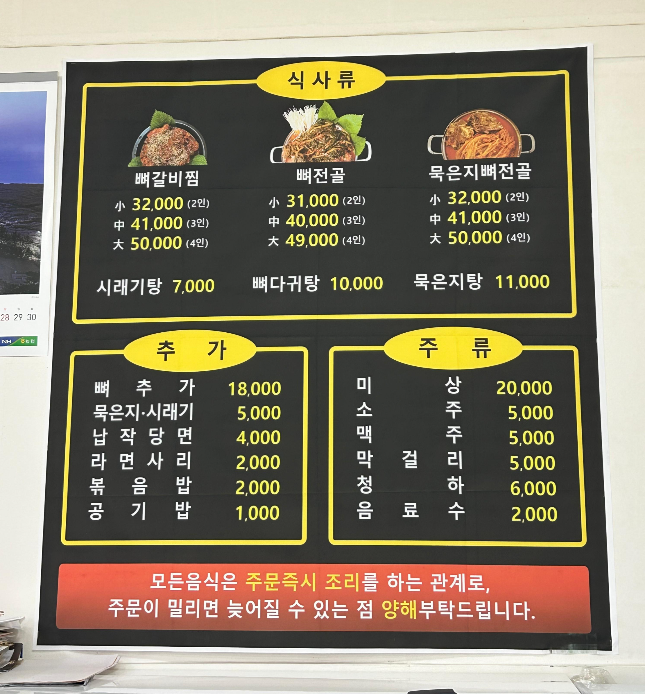 뼈갈비찜 小 32,000원, 中 41,000원, 大 50,000원 / 뼈전골 小 31,000원, 中 40,000원, 大 49,000원