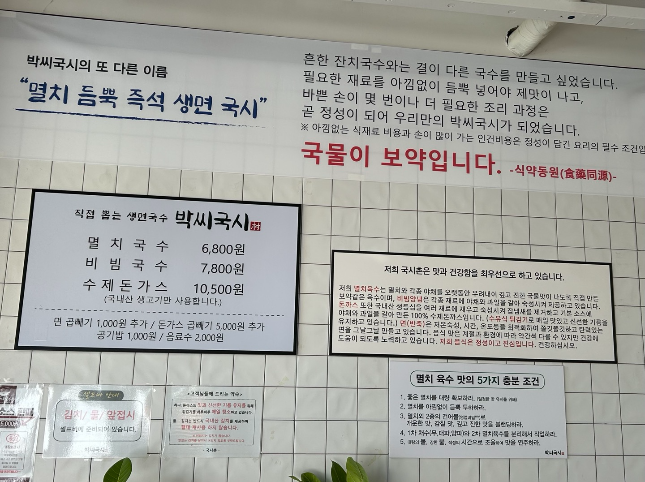 멸치국수 6,800원 / 비빔국수 7,800원 / 수제 돈까스 10,500원
