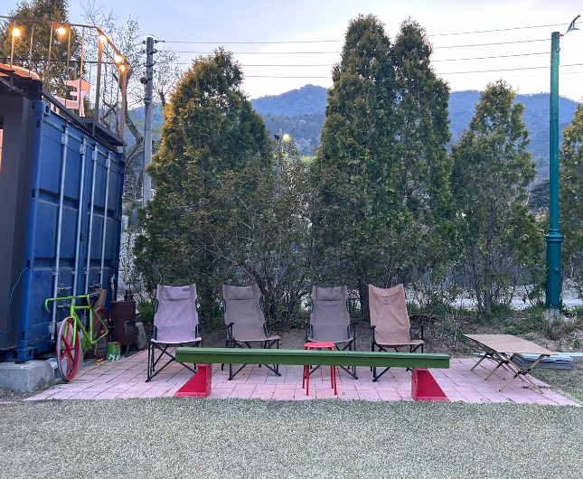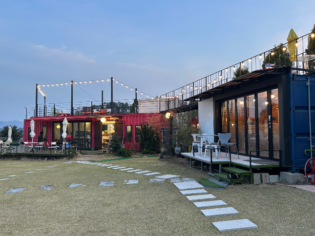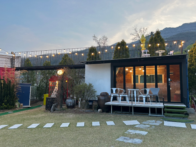 멀리 보이는 산, 노을 진 하늘, 넓은 마당에 이쁜 조명들 까지