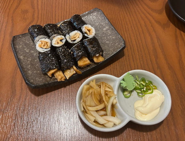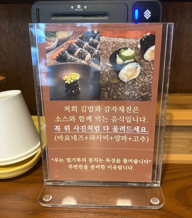 어묵김밥과 감자채전의 먹는 방법이 키오스크 아래 적혀져 있어 따라서 먹었더니 맛있더라구요!