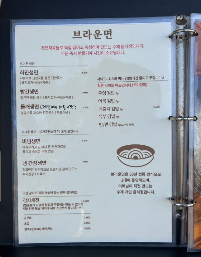 하얀생면 8,500원 / 빨간생면 9,000원 / 들깨생면(계절메뉴_10월 시작) 9,000원