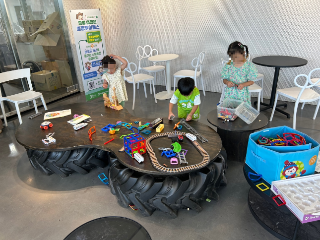 카페 한 쪽에는 여러가지 교구들과 소소한 장난감들이 모여 짧은 시간 아이들이 즐길 수 있었던 놀이공간이 있습니다.