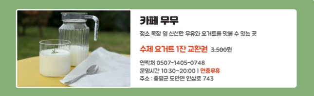 저희는 증평투어패스로 인당 수제 요거트 1잔 교환권(3,500원) 사용 가능한 카페여서 방문하였는데요.